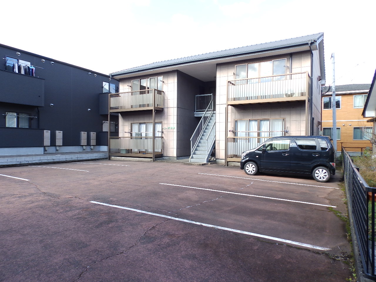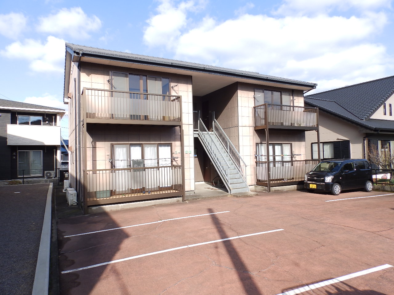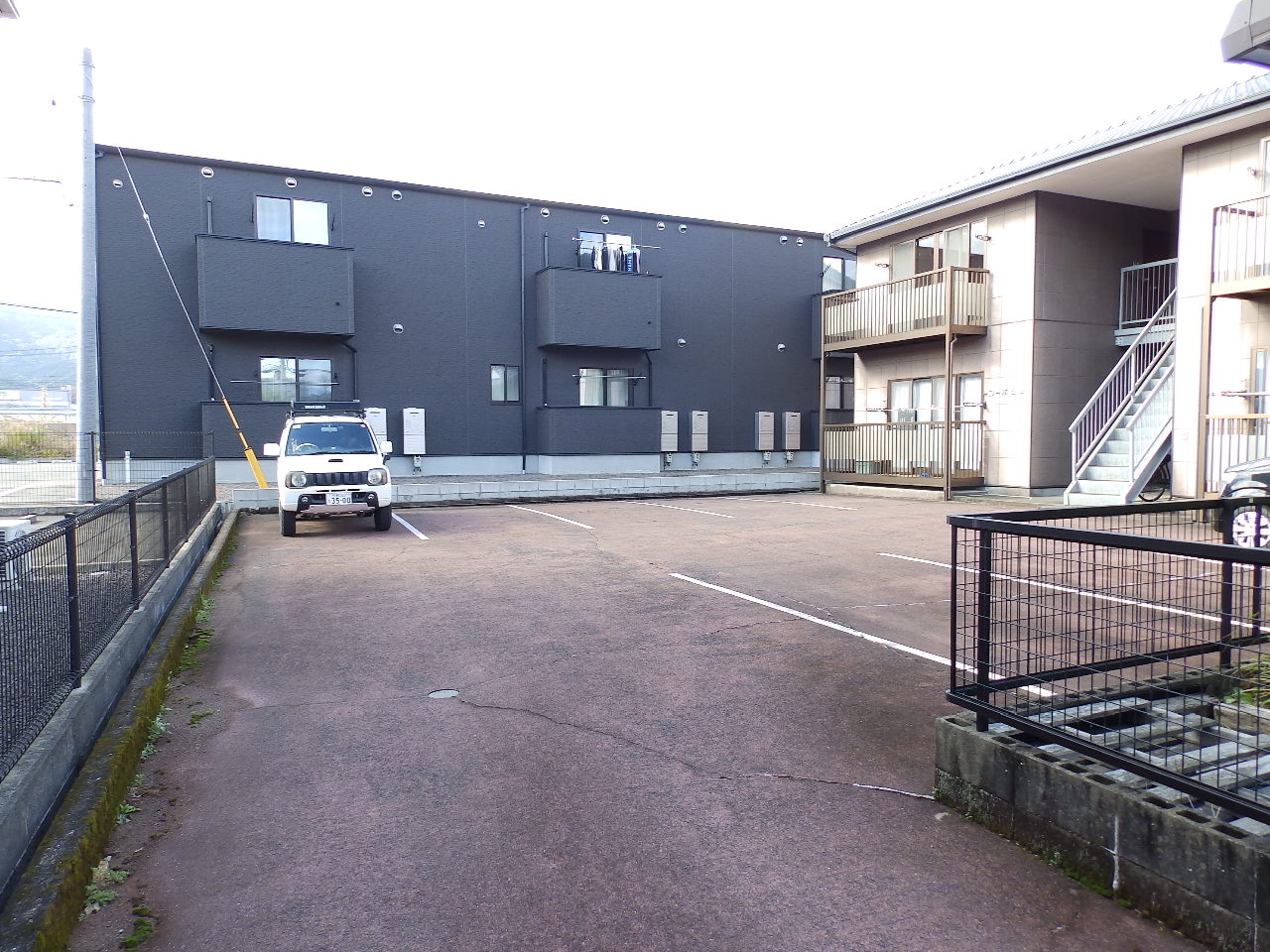 二里町川東有田川河畔の住宅街にあります。細い路地から入ったところにありますが、とっても静かな環境にあり、敷地内には1戸に付き2区画の駐車場8区画スペースがあり、建物は日当たりが良くバルコニーもあります。もちろん収益用ののアパートとしても、社員寮としても活用できます。